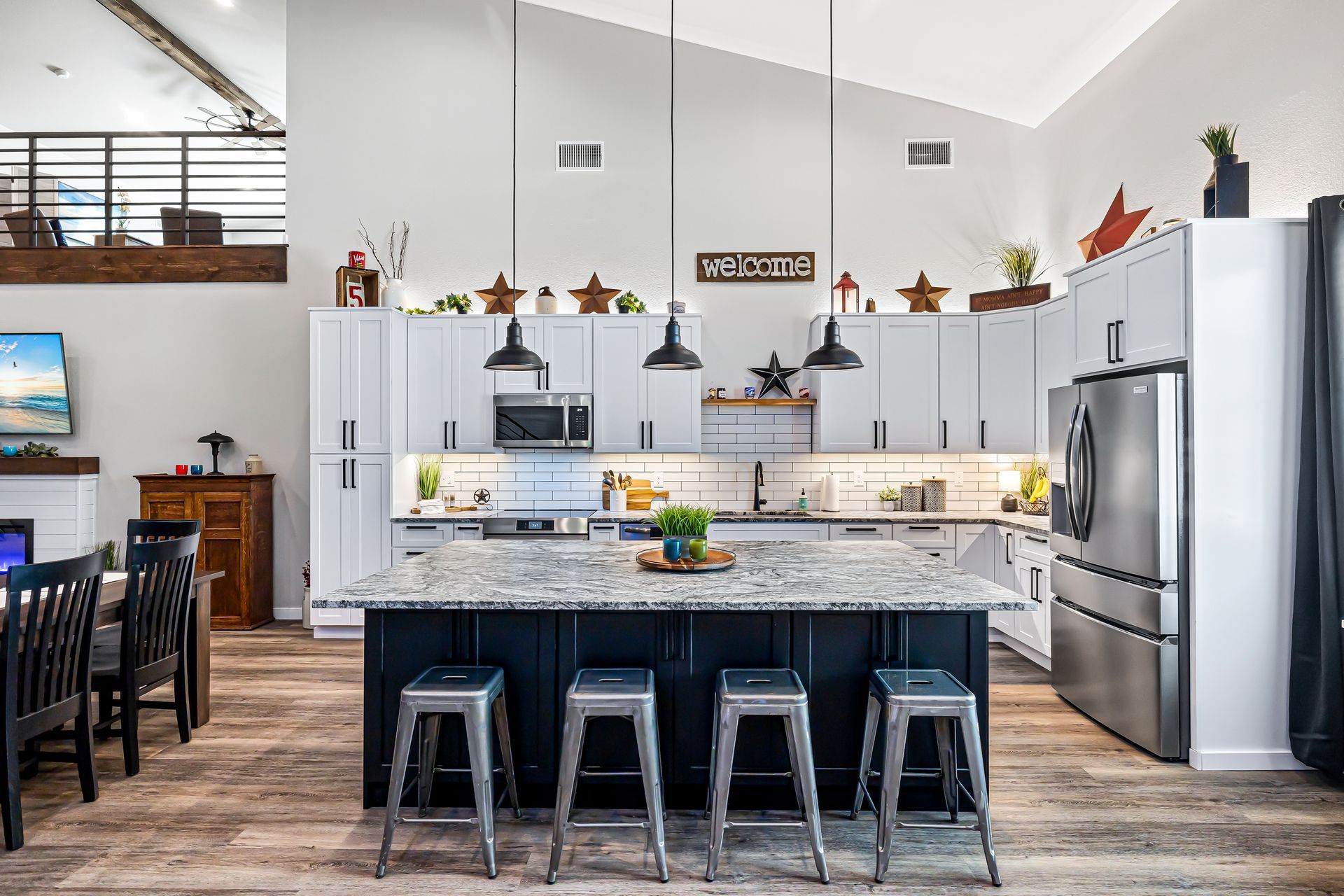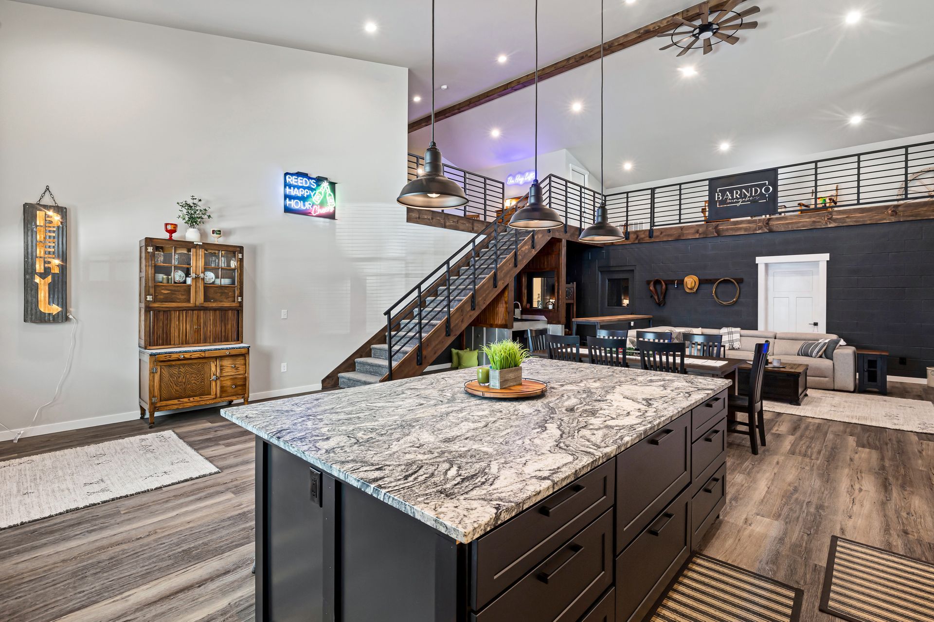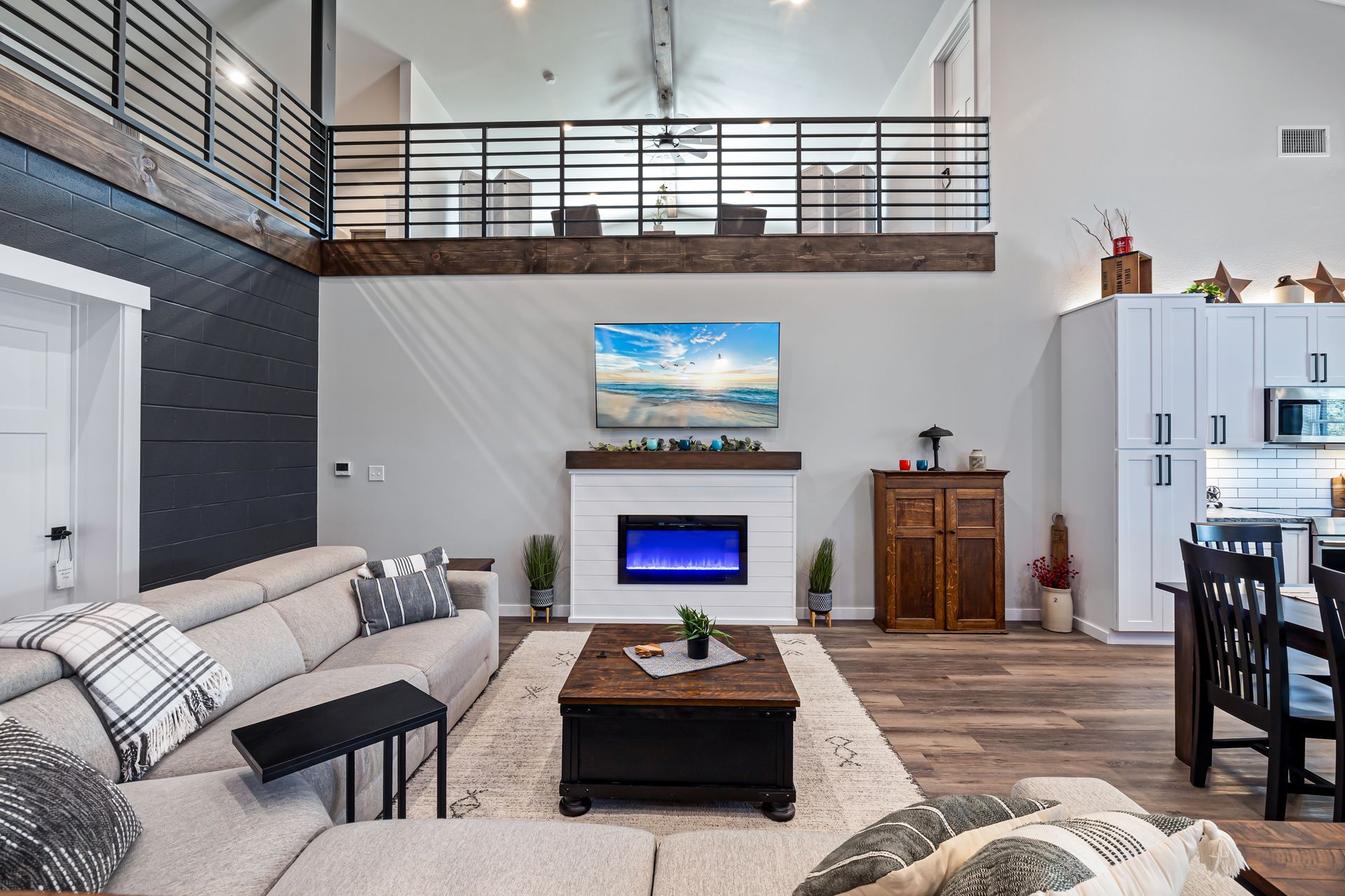 The Main Barndo + 8 Bungalow Package sleeps up to 36 people total and includes 8 of our luxurious private Bungalows PLUS the massive Main Barndo all priced into one easy bookable package (excludes Bungalow 6 & owner storage)! The Main Barndo provides that perfect extra gathering space for Reunions, Retreats, Wedding Party stays or any Group get-together! This package allows your group to all be together under one roof yet still have some privacy within the individual Bungalows. The Main Barndo offers TONS of space & features including a Full Kitchen with cookware, 2nd butler kitchen with barware, 2 living rooms, 4 Smart TV's, 4-person eating island, 8-person dining table, 5-person TV bar, fun Neon signs PLUS the Cool Upstairs Hayloft that offers a 2nd full Bathroom, 1 King Bedroom, 1 Queen Bed Loft/Office, 3 adorable Queen Bed Nooks & extra hang-out space! The Main Barndo sleeps up to 10 while the 8 Bungalows sleep up to 26 for a total package capacity of 36 people max at any time during group stays!