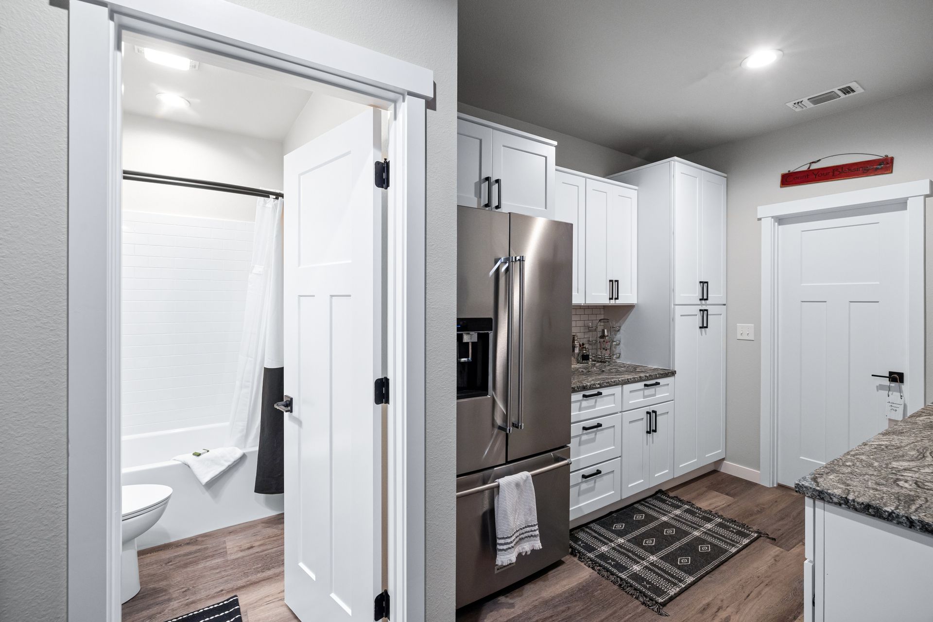Bungalow 4 is our most accessible unit offering a King bed, smart TV, open-concept shiplap closet, ADA compliant shower, sink & grab bars in addition to the standard bungalow features: private furnished patio, keyless entry, kitchenette w/ utensils, dining table, air-fryer micro, serene countryside views & more! Barndo Bungalows has 9 unique bungalows available for guest stays! Consider staying here during your next Reunion, Bachelor/ Bachelorette weekend, Travel Ball Tourney or Horse event!