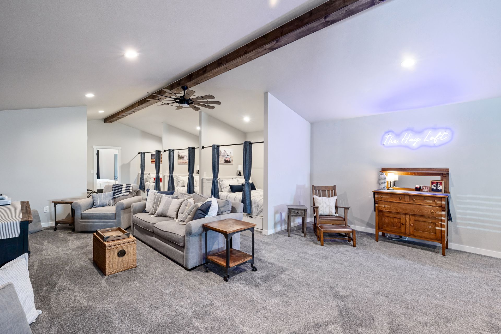 For group gatherings we also offer three package options: The 8-Bungalow plan, The 9-Bungalow plan or The 8-Bungalow plus Main Barndo plan! The latter includes 8 of our luxurious Bungalows PLUS The Main Barndo (excludes Bungalow 6 & owner/janitorial areas). The Main Barndo is the perfect extra gathering spot for Reunions, Wedding Stays, Work or Church Retreats, Birthdays, Cutting Horse events or any excuse to get your group together! The Main Barndo offers TONS of space and features including a FULL KITCHEN, 2nd butler kitchen, 2 living rooms, 2 large couches, 4 smart TV's, 8-person dining table, 4-person eating island, 5-person highboy eating bar, cool neon signs and direct access to the 25x50 front covered community area. Plus it can sleep up to 10 people! This whole package accommodates a maximum of 36 people on site at all times.