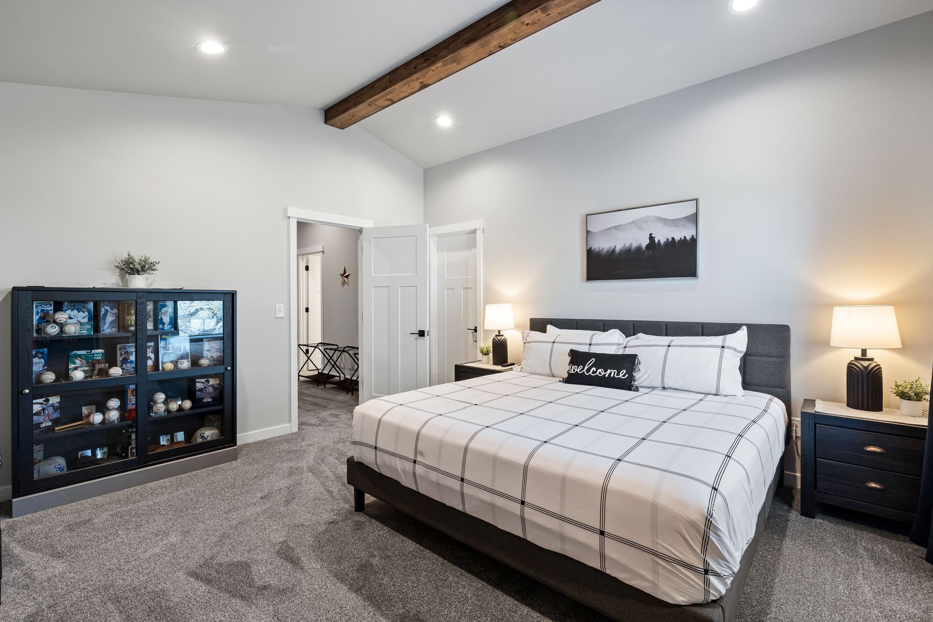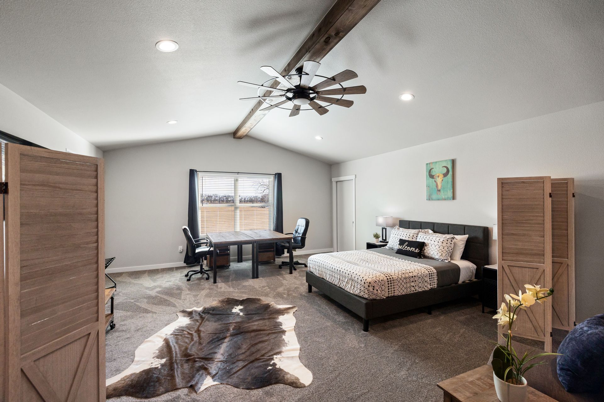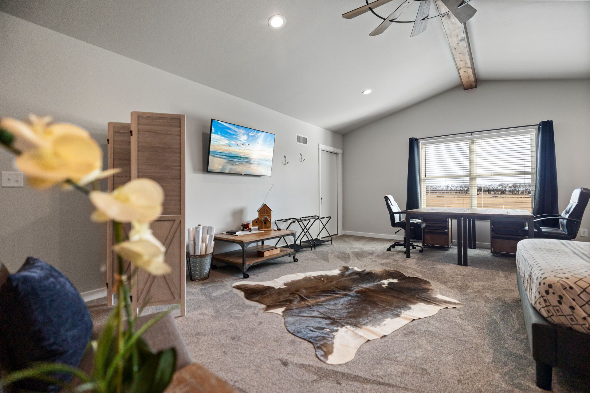 Bungalow 2 with vaulted ceilings, cedar beam & the Big Beautiful Horse picture has a King bed, smart TV and clothes closet in addition to the standard bungalow features of a private furnished patio, keyless entry, kitchenette w/ utensils, dining table, air-fryer micro, full bath, serene countryside views & more! Barndo Bungalows has 9 unique bungalows available for guest stays! Consider staying here during your next Reunion, Bachelor/ Bachelorette weekend, Travel Ball Tourney or Horse event!