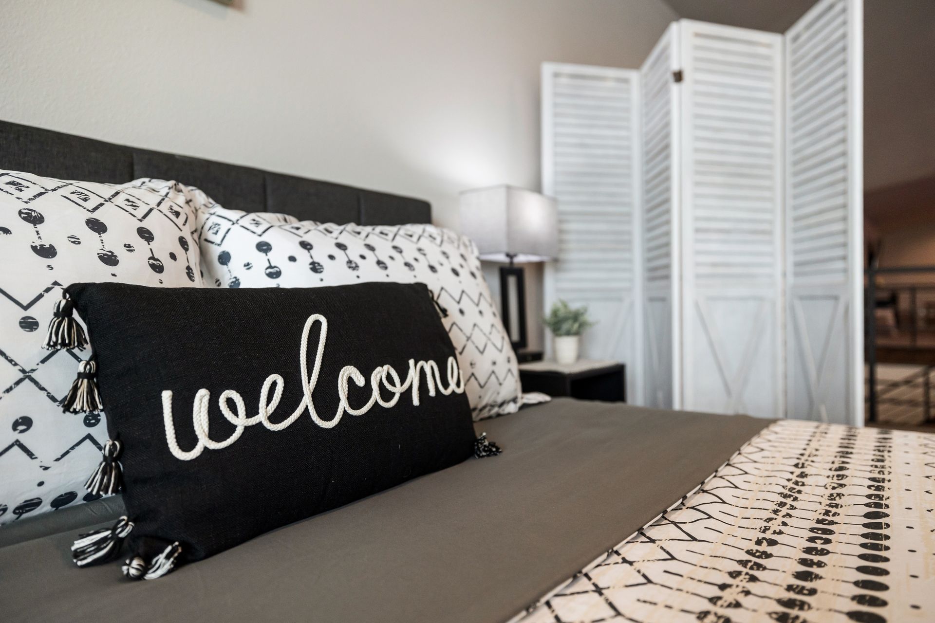 Bungalow 9 with black shiplap wall offers a King bed, full-sized pullout sofa, smart TV and an open-concept closet in addition to the standard bungalow features: private furnished patio, keyless entry, kitchenette w/ utensils, dining table, air-fryer micro, full bath, serene countryside views & more! Barndo Bungalows has 9 unique bungalows available for guest stays! Consider staying here during your next Reunion, Bachelor/ Bachelorette weekend, Travel Ball Tourney or Horse event!